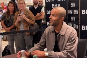 女球迷拿着湖人球衣让马刺名宿帕克签名,哭得梨花带雨的!